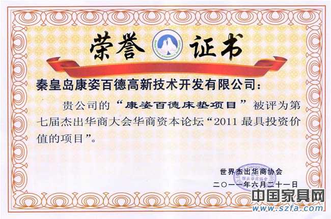 榮譽資質 證書介紹 2011年6月21日,第七屆杰出華商大會華商資本論壇在北京國際會議中心隆重召開。經過大會組委會討論和投票,康姿百德磁性寢具項目在眾多高科技項目中脫穎而出,當選為“2011最具投資價值的項目”。這一獎項的獲得證明了:康姿百德磁性寢具項目,在眾多投資者眼里是最佳投資選擇。 本次大會是第七屆杰出華商大會在“投融資領域”的專題服務大會,它針對投融資策略與方法、上市戰略與路徑、資本運作之道、實業家如何進入PE之門、熱點行業投資機遇、挑戰與對策進行了全面分析和討論。 康姿百德的發展目標明確、發展方向清晰,未來還將有更大發展空間。公司計劃將在兩年內上市,募集資金將用于磁性寢具、生態旅游、休閑康復、連鎖醫院等產業。 證書圖片 |