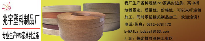 雄縣兆宇塑料制品廠是一家主要生產(chǎn)PVC仿木紋家具封邊條、U型扣、地板圈邊的專業(yè)工廠。我廠擁有多套生產(chǎn)設(shè)備,產(chǎn)品銷往石家莊、濟(jì)南、哈爾濱等多個地區(qū),受到廣大用戶的多次好評。我廠的PVC仿木紋家具封邊條使用環(huán)保材料生產(chǎn),韌性好,紋路清晰,修邊同色,同時價格低于同類產(chǎn)品10%到20%。