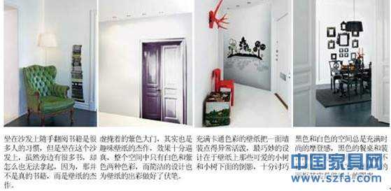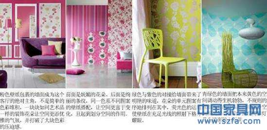 二、用絢爛打破平淡 性價比指數: ★★★☆☆ 玩 “ 墻 ” 指數: ★★★★☆ 視覺沖擊指數: ★★★★☆ 作為大面積鋪貼的壁紙,時常在空間中扮演打底的角色,需要怎樣的整體氣氛當然要由色彩來說話,絢麗的色彩可以給空間帶來活躍和動感的氛圍, 1 不同的色彩可以詮釋不同的空間熱度,有 90 度熱情的紅色, 80 攝氏度熱情的橙色,更有各種亮眼的色彩碰撞在一起的百分百熱情,你的熱情有幾度呢? 打造要點:絢麗色彩 + 花紋點綴 整體效果:壁紙的色彩十分廣泛,不同材質的壁紙可以產生不同的色彩氛圍和質感,紙基壁紙和 PVC 壁紙比較普遍,色彩眾多,容易清潔;而織物壁紙和植物壁紙在立體感的塑造上比紙基壁紙要略勝一籌,但是清潔起來比較麻煩,凹凸紋理的細節需要在保養上下一番工夫;其它的壁紙, 1 如金屬壁紙、熒光壁紙可以產生一些特殊的效果來裝點房間。和絢麗色彩相映成趣的當然是壁紙上的圖案,最常見的使用方法是在整體氛圍確定后,以局部點綴一些帶有花紋的裝飾圖案,把人的視覺重點自然地過渡到帶有圖案的墻面上,令鮮亮的色彩和各種圖案完美地融合在一起。