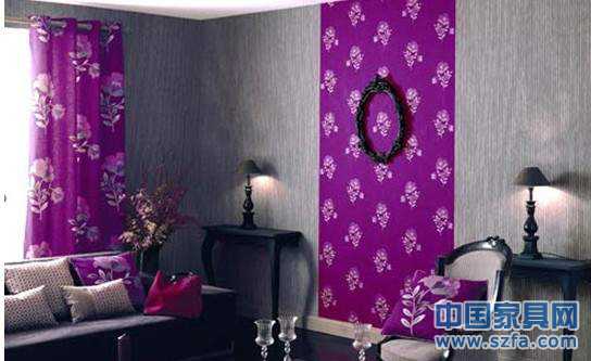 紫色、灰色紋狀墻紙+相同色彩的窗簾相配。