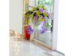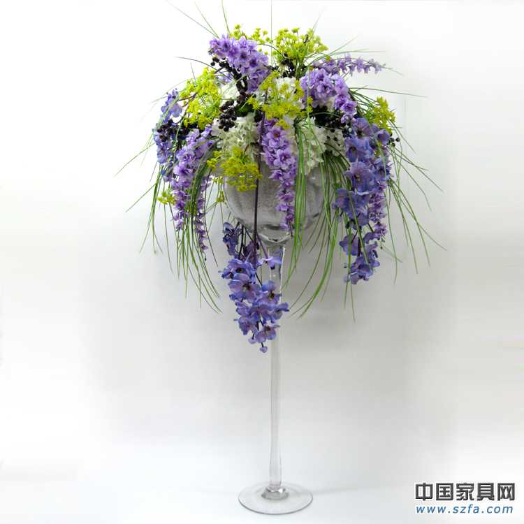 【套餐組成】由白色繡球,紫色彩雀,紫色萬代蘭,黃色蕾絲,塑膠草組合而成。適合賓館,客廳,工程用花。
