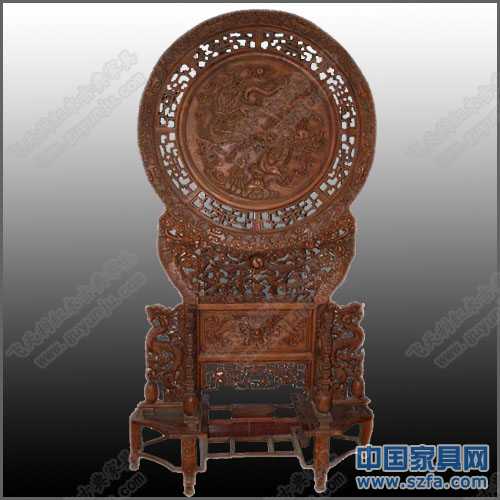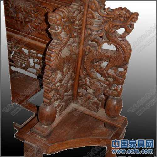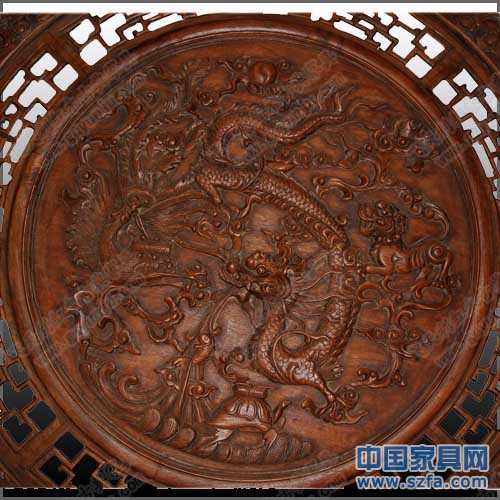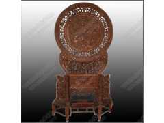 該地鏡、屏風采用上等緬甸花梨木制成,屏心與臺架為分體式。圓形屏心采用同心圓設計。外圓邊緣雕飾如意紋,內圓與外圓透雕拐子紋相接,內圓中心飾龍鳳呈祥圖。圖案為一龍一鳳,古人認為,龍為百獸之王,鳳為百鳥之王。龍鳳出現,天下就會祥和太平,百業興旺,五谷豐登,百姓就能安居樂業,幸福美滿。千百年來,龍鳳就是人們心目中的吉祥之物,是中華民族吉祥和平的象征。站牙透雕立龍,立體感強,盡顯威武之態。