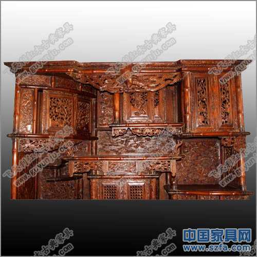 花梨木大鳥閣又稱“百寶格”或“博古架”,采用上等緬甸花梨木制成,采用防竹節紋和鳳紋的雕飾手法,給人以耳目一新的大鳳閣。大鳥閣是專為陳設古玩器物的。多寶格的獨特之處在于,它將格內做出橫豎不等、高低不齊、錯落參差的一個個空間。在視覺效果上,它打破了橫豎連貫等極富規律性的格調,因而開辟出新奇的意境來。