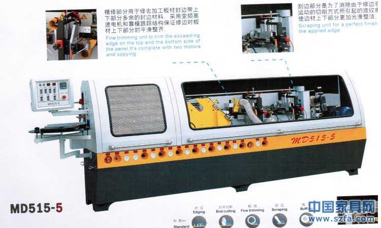 本機床能從板材送入后自動完成:粘接封邊、前后齊頭、上下平修(此項功能僅限MD515-6)、上下精修、上下刮邊(此項功能僅限MD515-5及MD515-6)、上下拋光六種功能,避免了手動加工過程中出現的加工誤差,保證了加工尺寸的一致性。本機床自動化程度高、封邊質量好、生產效率高,并且造型美觀、結構緊湊、工作穩定可靠,是板式家具生產廠家使用的重要設備之一。