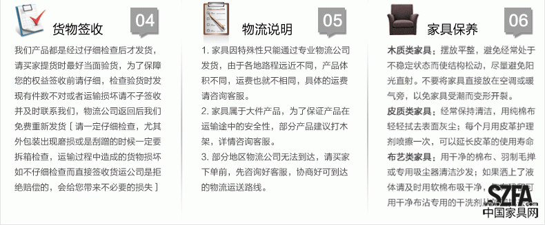 | 【主材料】 | 1.產品主框架均采用實木,其他結構包含部分復合板材; 2.所有板材都經過消甲醛處理,板材甲醛釋放量均優于環保水平,保證了家具的環保安全和無污染; 3.世界一流涂裝工藝,各項指標均符合GB18581-2001的標準要求,符合人體健康和環保的時代要求; 4.知名品牌五金件,長久使用不變形. |