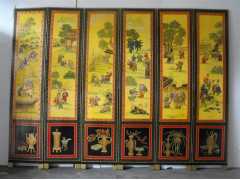 【產品工藝】純手繪漆畫屏風,堆金手法,畫面凸出有浮雕效果,貼金、銀箔工藝
