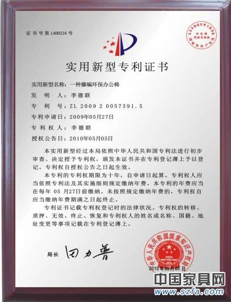 本實用新型專利產品解決了上述弊端,提供透氣、環保、無異味、耐磨、不變型、不掉色、舒適、使用壽命長、再生利用率高、結構精致、造型獨特等等功能。這種藤編環保辦公椅采用異型鋁合金骨架、旋轉椅腳和符合國際環保標準的仿真編織藤帶,利用現代人體力學知識設計制作而成,整體給人感覺既帶有古典韻味又不失時尚的簡約風格,滿足現代人的審美情趣。感性和理性的并存彰顯高雅與恬靜;綠色環保的主張,更符合時代的潮流和品味。