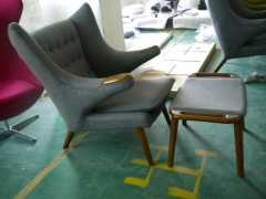熊椅整個椅子和腳踏都是水曲柳實木架。(PP120)熊椅又叫The Teddy Bear Chair,是丹麥名設計師Hans J.Wegner 1951年設計的。在他92年之前他設計的椅子達到500張,被稱為“椅子大師”,此款熊椅的設計展現出 Hans Wegner 有機有趣設計的一面,椅子還被評論家稱為:“伸出熊掌的大熊”。