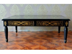 法式宮廷盧浮宮鑲銅雕花實木黑色茶幾,是唯優家居設計師設計,并由唯優家居旗下工廠量身定制的法式宮廷家具組合套裝中的其中一件產品。本商品樺木為實木框架,密度板、銅箔、高檔五金件等作為輔助材料,采用黑色封閉半啞光漆、銅箔鏤花的先進工藝,高貴莊重