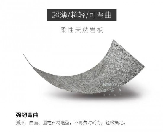 成品厚度1-3mm,每平米重量約1.5kg左右,其產品具有天然石材質感,超輕,超薄,強韌可彎曲,可透光等特點,最大限度提升石材利用率,為節省能源,降低運輸與安裝消耗做出巨大貢獻,不但改變了多年來使用粗石材的歷史,更因其獨特的自然紋理,超強的任性和可進行極限彎曲的特性,為石材裝飾創造了更多的可能性。