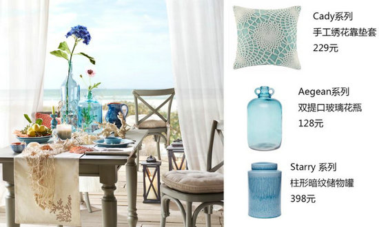 兩個色彩冷暖融匯,重點出現在Harbor House家紡和飾品中。多款美式靠墊、花瓶、毛巾和首飾盒春夏新品,都采用大面積純色,綴以水洗、立體繡花等工藝,凸顯色彩本身的自由與溫柔。在美式床品設計上,則主要運用珊瑚、海葵、繁花圖案,點睛休閑家居搭配。