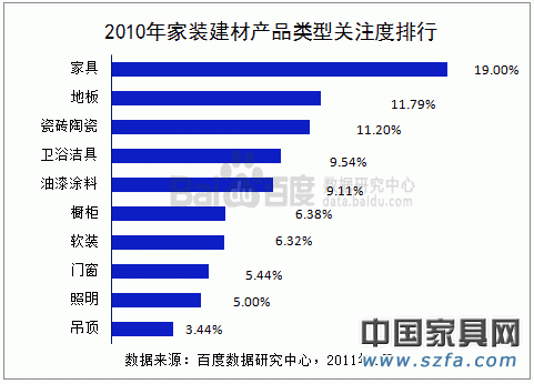 裝修所需產品品類繁多,在整個裝修流程中,家具是網民最為關注的建材產品,關注度為19.00% ;地板和瓷磚陶瓷的關注度均超過10%;衛浴潔具、油漆涂料、櫥柜和軟裝、門窗、照明、吊頂名列第四到第十位。