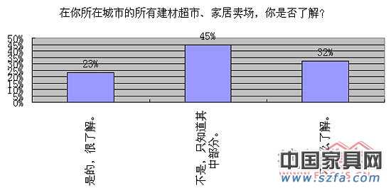 隨著家居建材以及裝飾裝修市場在近年來的不斷擴張,包括上海、杭州、南京等地在內(nèi)的華東省市更迎來一股明顯的家居賣場擴張潮。從小區(qū)門口的家具店、五金建材店,到當(dāng)?shù)乇就两ú某械臒峄稹⑷珖笮瓦B鎖賣場的洶涌來襲,再到跨國資金國外賣場品牌的入駐……讓人眼花繚亂的同時,消費者的選擇也越來越多。面對這一變化,消費者對自己所在城市的所有建材超市、家居賣場,究竟了解多少?截至2011年2月23日下午15點14分,共有348位網(wǎng)友參與調(diào)查,網(wǎng)友所在區(qū)域主要覆蓋上海、杭州、南京,以及江浙周邊的華東城市。從投票結(jié)果可以看出,雖然賣場擴張速度快,擴張步伐大,但是對于普通消費者而言,他們的關(guān)注范圍還比較有限。45%的網(wǎng)友表示只知道其中部分,32%的網(wǎng)友表示不怎么了解,僅23%的網(wǎng)友表示自己很了解。而在日前,搜狐記者前往紅星美凱龍滬南店實地考察時,某家具品牌門店負(fù)責(zé)人這樣告訴記者,開業(yè)以來,到店里的消費者90%是浦東當(dāng)?shù)氐模碛?0%從其他地區(qū)過來的,其中大部分也都住在浦西中環(huán)附近距離該門店車程比較方便的地方。由此不難看出,地域性對于消費者對當(dāng)?shù)亟ú某小⒓揖淤u場的認(rèn)識起到不小的作用。