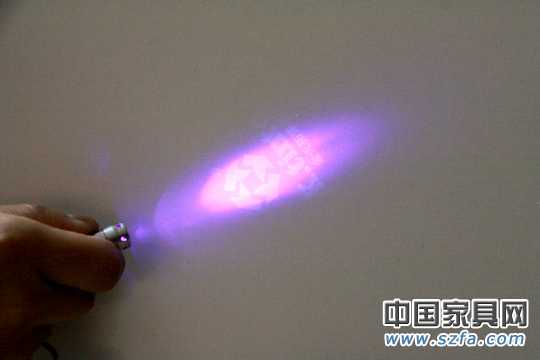 記者看到,只要消費(fèi)者現(xiàn)場(chǎng)用紫外光(波長(zhǎng)200~400μm)照射,板材上“金天拓”的品牌標(biāo)志將頓時(shí)閃耀呈現(xiàn)。(建議采用常見(jiàn)的驗(yàn)鈔筆照射)