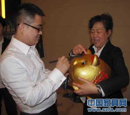 | 圖示:伊麗百蘭副總經理賈迎軍先生為銷售冠軍杜麗雅女士簽名頒獎 |