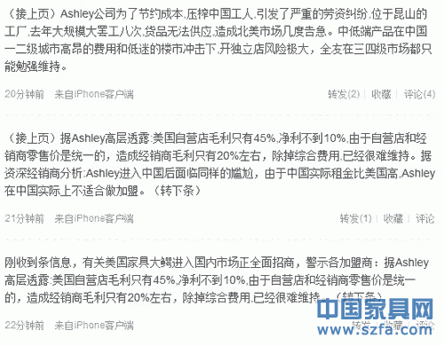 剛收到信息,有關美國家具大鱷進入國內市場正全面招商,警示各加盟商:據Ashley高層透露:美國自營店毛利只有45%,凈利不到10%,由于自營店和經銷商零售價是統一的,造成經銷商毛利只有20%左右,除掉綜合費用,已經很難維持。