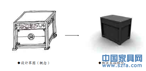 不考慮所有裝飾部件,僅用最基礎的結構件構筑產品的骨架,以此骨架作為產品的基礎模型。在此,我們假設前期的市場調查、產品概念及企劃、方案構思都已完成,依照我們原定的方案,開始進行擴展設計。并借用一款中國傳統漆藝床頭柜的設計的案例加以說明。