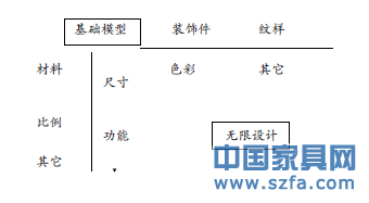基于標準化生產體系,我們將需要“大動干戈”的擴展設計定義為“縱向設計”(如:需要選用不同的開料方式等),將那些只需要個別工序調整的擴展設計定義為“橫向設計”(如:僅需要換用一個五金裝飾件等)。