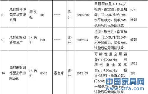 本次抽查中發現,有30批次的木家具產品不合格,其中包括成都安帝博森家具有限公司3D床頭柜、成都紫玉家私有限責任公司666“紫玉” 床頭柜、成都市華之龍家俱有限公司“華之龍”活動柜在內的10批次產品甲醛釋放量不合格。另有有25批次產品穩定性不合格、3 批次產品抽屜滑道強度不合格、1批次產品可溶性重金屬超標。