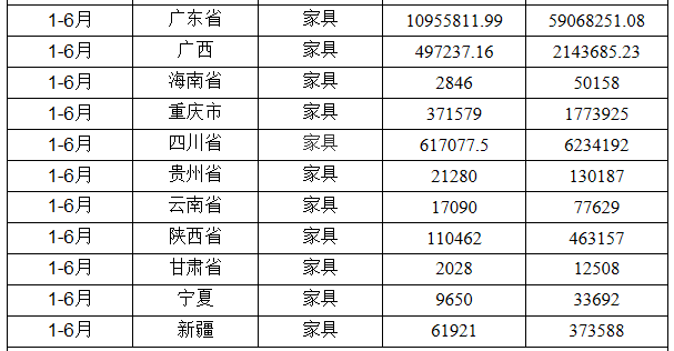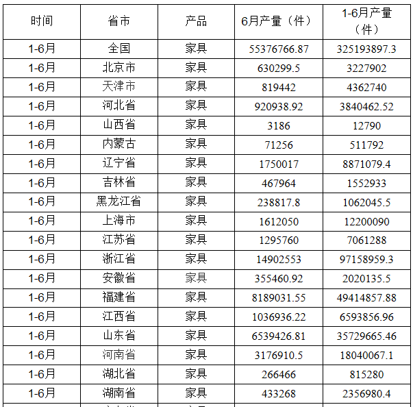 核心提示:2012年1-6月中國家具分省市產量數據統計: