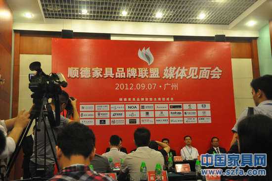 2012年09月07日,順德家具品牌聯(lián)盟于廣交會展館A區(qū)花城廳舉行了媒體見面會。包括廣東電視臺、廣州電視臺、《廣州日報》、《南方都市報》、《羊城晚報》、《南方日報》、《新快報》、《信息時報》、香港《文匯報》、《珠江時報》、《民營經(jīng)濟(jì)報》、《佛山日報》、《香港商報》等超過25家大眾媒體及《亞太家具報》、《珠三角家具報》、《000家·財富》、《政府采購信息報》、天天家具網(wǎng)、新浪網(wǎng)、搜狐網(wǎng)等超過15家家具行業(yè)的媒體記者朋友到場進(jìn)行采訪,中國家具協(xié)會理事長朱長嶺先生、中國對外貿(mào)易廣州展覽總公司總經(jīng)理李德穎先生、廣東省家具協(xié)會會長王克先生、順德區(qū)家具協(xié)會會長黎德先生、順德家具品牌聯(lián)盟主席周振揚(yáng)先生出席了見面會并發(fā)表了講話,見面會由順德家具品牌聯(lián)盟高級顧問莊子標(biāo)先生主持。