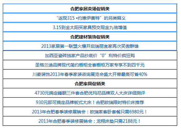縱觀合肥家居折扣報,建材家具促銷基本上持平,眾多商家正把眼光緊盯著“3.15”。而從記者現場采集的信息來看,2013年3月份家居促銷力度絲毫不比去年差,眾多商家更是看好今年的市場。從合肥3月份天氣來看,非常適合裝修業主裝修,時下正為裝修發愁的業主,大可關注萬家家居最近的春裝活動。