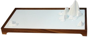 展品介紹:試圖將國畫山水的平面形態轉化為三維意境。過程是純理性的三維軟件運算建模,由模具廠數控精加工成為原模,再翻制成石膏模具,制成陶瓷山水。結果,一個近乎三維游戲的場景竟然也可以如此感性!因為,大家都遺傳了山水的情懷。