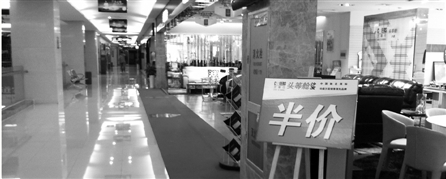 昨天上午,陰雨綿綿。雖然沒有像傳言那樣停電??照{,歐亞達濱江店仍然照常經營,但人氣跌到了谷底。記者視線范圍內營業(yè)員比顧客要多得多,差不多三分之一的店面處于關門或半歇業(yè)的狀態(tài),堅持營業(yè)的也都在門口豎起牌子——雙休特惠,或干脆“半價”。