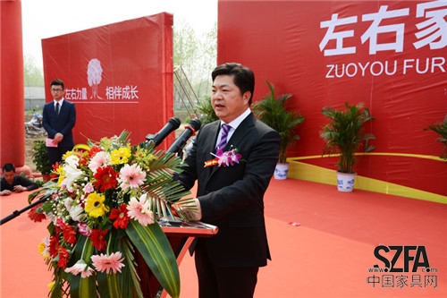 宿州市市長史翔,市委常委、宣傳部部長何志中,副市長邵郁,市政協副主席何平,高新區管委會黨工委書記、副主任祖鈞公,市局相關部門領導,深圳出入境邊防檢查總站副總站長、深圳市政協委員黃黎雄,深圳市家具行業協會會長、深圳市左右家私有限公司董事長黃華坤,深圳市家具行業協會執行會長、深圳市仁豪家具發展有限公司董事長尤國忠,深圳市家具行業協會榮譽主席、香港興利集團執行董事黃偉業,深圳市家具行業協會秘書長洪小惠,中國家具銷售商聯合會名譽會長、蘇州市亞博家藝有限公司董事長楊亞中,中國家具協會副理事長、安徽省家具協會理事長、宿州海鵬家居產業投資有限公司董事趙卓華出席奠基儀式。除此之外,出席奠基儀式的還有深圳家居企業深圳興利集團、圓方圓、仁豪、德勝家私、森堡家私、七彩人生的企業家,及左右家私來自30多個地市的代理商。史翔、黃華坤、趙卓華等分別熱情致辭,市長史翔宣布開工并揮鍬奠基。