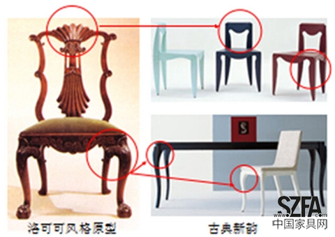 對于原型模仿而言,相對比較直接和直觀,無需贅述。但即便如此,也得緊緊抓住原型中的典型特征。如:路易十四式風格家具中最突出的特征是在家具本體的角部與拉手部位有黃金裝飾,另一個重要的體態特征是桌椅類家具常用“S”型彎腿。如圖1所示。