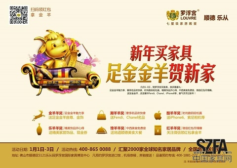 羊年即將到來,羅浮宮家居集團將在元月1-3日推出“新年買家具 足金金羊賀新家”大型促銷活動,奉上百萬豪禮回饋市民:8座足金賀歲金羊,還有Iphone6、芬迪Fendi圍巾、香奈兒香水、索尼數碼相機等超級豪華大禮,還可獲贈價值超千元的家居飾品、超值美食券,品嘗地道順德美食,讓客人在購物之余暢享舌尖上的盛宴;活動期間,所有客戶只要購物滿一定金額就可享受大轉盤抽獎活動,且所有參與者均百分百中獎。