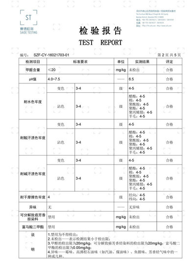 ④梨頌面料:理化性能:異味、pH值、耐水色牢度、耐酸汗漬色牢度、耐堿汗漬色牢度、耐干摩擦色牢度;環保性能:可分解致癌芳香胺染料、甲醛含量、富馬酸二甲酯。