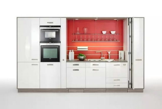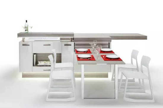保持整個空間的整潔性是海福樂開放式廚房的設(shè)計初衷,整個廚房在無需使用的時候可以隱藏在門板背后,簡約大方的外觀下隱藏著“亂糟糟”的廚房空間。使用時可以拉開門板,各種廚房餐具應(yīng)有盡有,同時操作臺也可以一邊移動一邊保持使用狀態(tài),烹飪美味佳肴的同時可與家人暢快聊天。Hublift拉伸餐臺讓你在整齊和寬大桌面間自由地?zé)o縫切換:可以將廚房爐灶隱藏起來保持整潔,拉伸出來工作區(qū)或用餐區(qū)一點兒不少, 家里來多幾個客人也不成問題。