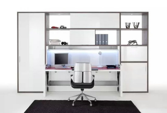 由于工作時間和休息時間的不可同時性,海福樂極具創(chuàng)造性地將床和書桌臺設(shè)計成一體,床和書桌之間的功能轉(zhuǎn)變可以有效地提高空間利用率,讓39平米的空間發(fā)揮出雙倍空間的價值,完美闡釋了“時間換空間”的設(shè)計理念,床或者書桌的打開取決于房屋主人的休憩或工作需要。
