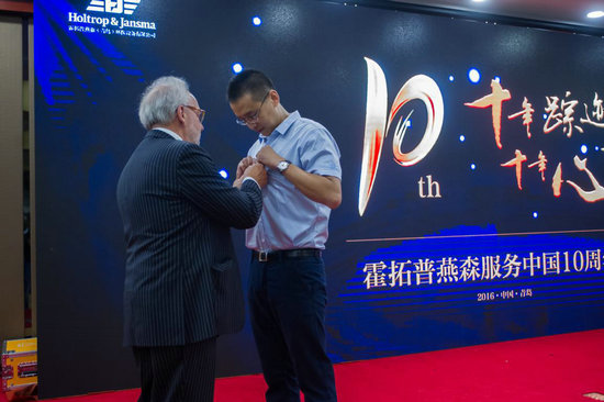 霍拓普-燕森公司董事長Lindemann先生親臨活動現場,發表了飽含深情的致辭。Lindemann先生對中國文化和歷史都非常喜歡,對中國市場未來發展非??春茫敉仄?燕森在中國市場的開拓寄予厚望。Lindemann先生還回顧了與霍拓普燕森(青島)公司總經理閆方先生的結識淵源,對閆方先生這十年來推動公司發展所做的貢獻表示感激,稱贊閆方作為一個企業帶頭人表現出了卓越的才能和高尚的品質。十年攜手發展歷程,情感積淀下深厚友誼,Lindemann先生視閆方如同自己的兒子般親近,在國內外商業合作史上,于今日成一段佳話。