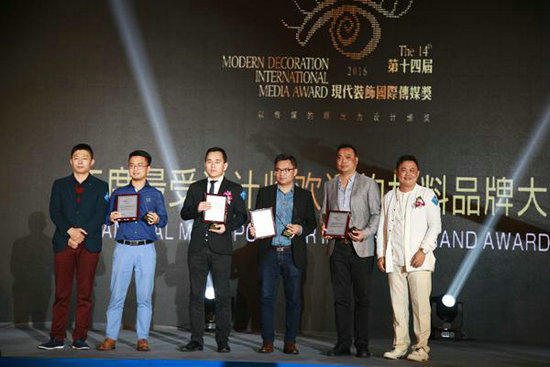 精彩的節目結束,最后一輪頒獎儀式繼續開啟。接著頒發的獎項是“年度最受設計師歡迎的材料品牌大獎”。由PINKI品伊創意集團&美國IARI劉衛軍設計事務所創始人、創意總監劉衛軍,現代裝飾雜志社總經理張志有擔任開頒獎嘉賓頒獎。獲獎單位是: