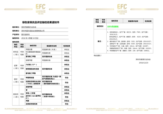 12月23日,中國綠色家具優品2015年四季度10月份抽檢工作完成。作為目前中國家具唯一參與的軟床企業,圓方園的品質受到行業的高度關注。經過深圳家具研究開發院檢測中心賽德檢測的嚴格抽檢,圓方園10月份原輔材料抽檢合格率100%,不負眾望。