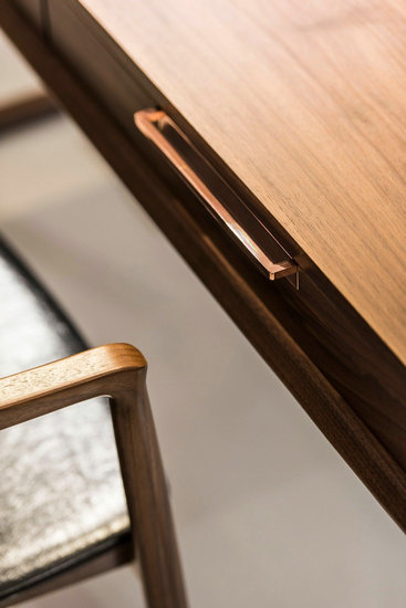 硯臺書桌,三面圍合,從硯臺獲得靈感。采用牛皮系帶和黃銅扣件制作的翻蓋面板拉手,減少了拉手與手的摩擦,并調整與桌面板的關系;金屬把手的運用,將金屬與木材相結合,開創了MZGF木智工坊的歷史;MDF(中密度纖維板)實木貼皮工藝,避免實木開裂、純板式家具木皮易爆邊、脫落的問題,縮小了傳統實木工藝色差,增加了美感。