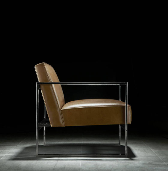 Alum休閑椅的設計師將金屬與進口頭層牛皮碰撞、不銹鋼的幾何直線條與進口牛皮軟包形成冷硬與溫柔的對比,獨特且耐人尋味。