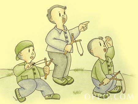 無論在農(nóng)村還是在城里,大概沒有不玩彈弓的。尋根樹杈,纏上兩根皮筋,一副簡易的彈弓也就制作完成了。對男孩子來說,彈弓的魅力是無與倫比的,可以約上三兩伙伴一起去打鳥兒,打傷大院里的老母雞,打碎隔壁家的玻璃;歡樂總是伴隨著淡淡的悲傷,彈弓總會被比自己大的伙伴、家長、老師沒收。那年的我們總是那么的萬能,用不了多久一把新彈弓又會出現(xiàn)在我們的手上。