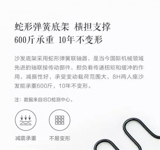 小米官方宣稱,8H獨(dú)立袋裝彈簧布藝沙發(fā)采用Thomasville(美國白宮沙發(fā)供應(yīng)商)萬元級配置,這應(yīng)該就是所謂“白宮級級別坐感”來源。布料采用色織工藝,線染后織,水洗不易褪色。兼具防水防污性能,液體撒落后形成水珠并滑落,即使有少量污物附著,用紙巾即可輕松擦除。沙發(fā)內(nèi)部采用超行業(yè)標(biāo)準(zhǔn)的35kg/㎡高密度回彈海綿作為坐墊填充物,每個坐墊均配有49個精鋼獨(dú)立袋裝彈簧作為內(nèi)部支撐,可承受8萬次沖擊不變形。此配置以往只用于萬元級沙發(fā)。沙發(fā)底架采用蛇形彈簧連軸器,兩人座沙發(fā)能承重600斤,號稱10年不變形。沙發(fā)框架采用生長于海拔2000米的俄羅斯落葉松,硬度強(qiáng),板材達(dá)到CARB P2級美標(biāo),環(huán)保健康。