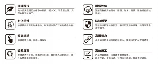 美中美石材專用涂料經整體涂裝施工后,漆膜干燥速度快、全效凈味,可使基材表面完全封閉,底色均勻自然,手感絲滑溫潤,同時附著力強、耐磨、耐刮、耐燙、耐污、耐水、耐候、耐酸堿鹽腐蝕。產品寬容度高,施工簡易快捷,施工時添加微量修色精油可均衡石材底色而不破壞自然美感。涂裝應用后能夠充分提升石材表面裝飾效果及物理化學性能,使石材更好的與不同品類家具元素搭配。