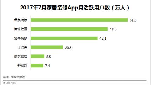 據智察大數據監測顯示,在2017年7月家居家裝App月活躍用戶數上,最美裝修以61.0萬人排在第一位;籬笆社區排名第二,為48.5萬人;窩牛裝修排列第三,為42.1萬人;土巴兔位居第四,為20.3萬人;麗芙家居排行第五,為8.5萬人;齊家網排在第六位,為7.9萬人。