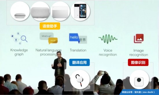 2016年,谷歌CEO桑達爾·皮查伊在谷歌大會提到了自家的AI技術,有知識圖譜、自然語音處理、翻譯、語音識別、圖像識別這六點。這六點具體在科技產品上的體現,可以劃分為語音助手、機器翻譯和圖像視覺。