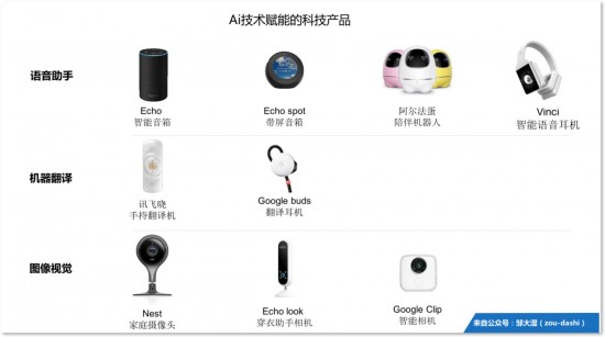 語音助手:語音是最先產品化落地的AI技術。亞馬遜的Echo音箱自發布以來,累計銷售了近2000萬臺;國內外,智能音箱層出不窮,目前基本已經回歸巨頭競爭的格局,創業者幾無機遇;語音技術的成熟,在國內也催生了陪伴機器人的新品類,在15年16年喧囂過后,17年市場趨于冷,勝出者寥寥(見消費機器人早已競爭紅海,黑馬突圍有三條路徑)。語音助手在捧紅了智能音箱之后,逐漸開始在可穿戴設備上普及流行。語音耳機、智能眼鏡,逐漸浮現在人們視野中。這部分內部會在下文中重點講解。