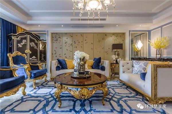 客廳尊貴的藍色與明亮的金色互補,頗具皇家氣派,背景墻與裝飾柜上的銀杏元素,在秋意漸濃的時節尤為應景。