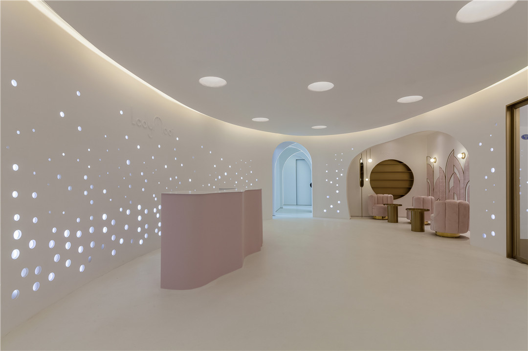 本次獲獎作品《lady mooi 女子醫療美容機構》其靈感源自兩歲女兒的睡前故事,設計摒棄了以往該類型空間所采用的慣常的符號化做法,以“人魚公主”的故事為設計靈感,提取氣泡、水等夢幻元素,營造輕松、舒適、浪漫的環境,讓愛美的顧客們在這里有仿佛置身夢幻水世界的感受。一圈沖孔板從下往上、由大到小不規則排列,仿佛海底世界的氣泡,簇擁成柔軟、純凈的橢圓形空間。過道用燈帶鑲嵌半弧形攻門,錯落之間,一步一世界,那份變身的莊重在魔法的推演中漸漸實現。