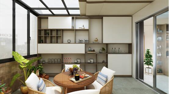陽臺是擴充空間的一塊寶地,歐派克-全空間移動系統解決方案之陽臺空間解決對策,創造了一套提升陽臺空間利用率的移動組合:磁懸浮推拉門、陽臺儲物柜,以及陽臺裝飾柜,既節省了空間,又提升了空間的利用價值,還與客廳達成了審美形式上的統一。