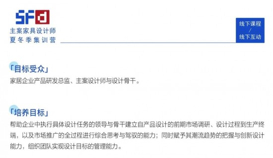 面向設計師的SFD夏/冬季主案設計師集訓營,更是通過21天的長周期,讓主案設計師跳出現有僅關注產品造型設計的窄距視野,真正具備在設計前找到依據、設計中科學推進項目、設計時恰當表達的能力,從而整體提高設計管理的水平。