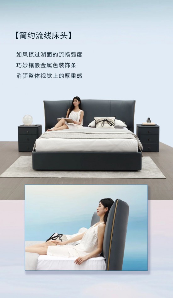 核心提示:簡約流線床頭,如風掠過湖面的流暢弧度,巧妙鑲嵌金屬色裝飾條,消弭整體視覺上的厚重感。